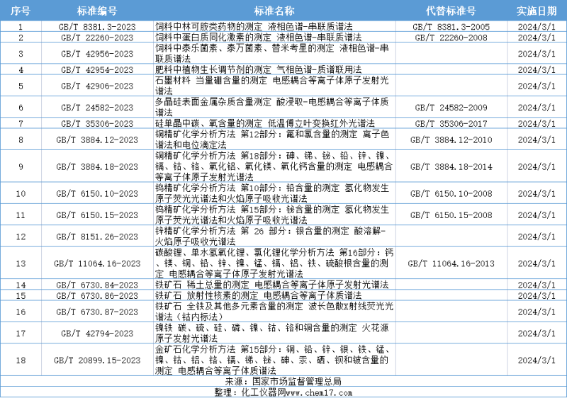 此次发布的431项标准涵盖石油化工、医疗卫生、环境保护、纺织、工业、食品等诸多行业,其中有部分为检验检测相关标准,包括《GB/T 8381.3-2023 饲料中林可胺类药物的测定 液相色谱-串联质谱法》《GB/T 22260-2023 饲料中蛋白质同化激素的测定 液相色谱-串联质谱法》《GB/T 42954-2023 肥料中植物生长调节剂的测定 气相色谱-质谱联用法》《GB/T 6730.84-2023 铁矿石 稀土总量的测定 电感耦合等离子体原子发射光谱法》等。