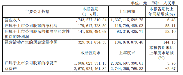 报告显示,2023年上半年,紫燕食品实现营业收入17.43亿元,较上年同期增长6.48%;归属于上市公司股东的净利润1.80亿元,较上年同期增长55.11%;归属于上市公司股东的扣除非经常性损益的净利润1.42亿元,较上年同期增长52.10%。