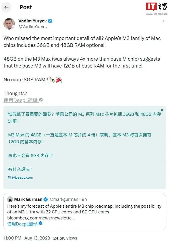 稍晚些时候,另一名苹果报料人 Vadim Yuryev 转发 Gurman 的推文时作出如下补充:“是不是有个最重要的细节被忽略了?M3 Max 配备了 48GB 的内存,这意味着基本版 M3 将首次配备 12GB 内存,再也不会有 8GB 内存了!有什么想法吗?”