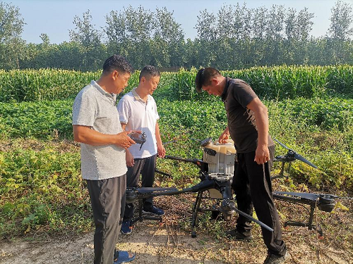 大豆玉米带状复合种植示范基地的农作物长势喜人,6行低矮整齐的大豆带与4行两米多高的玉米带一高一低、和谐共生。飞手贺振洲熟练的操控着植保无人机在距离作物冠层上方1.8米左右来回穿梭,旋翼下巨大的气浪推动农药雾流均匀喷洒附着在农作物叶片上,快速完成对各种病虫害的消杀。气浪把玉米柱头上的雄花花粉吹落在花丝上,有效提高授粉率,后期的籽粒结实率将会明显提高。一台植保无人机当天就完成了500亩示范基地的农药喷洒任务。基地的科技示范户胡广东介绍说:“我种植的大豆品种是郑1311,玉米品种是隆创310,种植模式是6行大豆+4行玉米。刚开始把种子播下去的时候,一直都有些担心,生怕搞不好田间管理影响了收成,这下子好了,咱们农技员把技术送到田间地头,心里就踏实了,相信今年肯定会有一个好收成,1亩地收获130公斤大豆和500公斤玉米应该没什么问题,相比较单纯种植玉米或大豆,1亩地能增加收入几百元,今年种好了,以后年年都这么种,叫乡里乡亲都来种!”