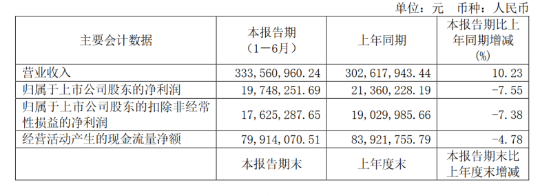 报告期内,海正生材实现营收3.33亿元,较去年同期增长10.23%;实现净利润1974.83万元,较去年同期下降7.55%;实现扣非后净利润1762.53万元,同比下降7.38%。其中,纯聚乳酸树脂产量较去年同期增长35.75%,复合改性聚乳酸树脂产量较去年同期下降32.09%。