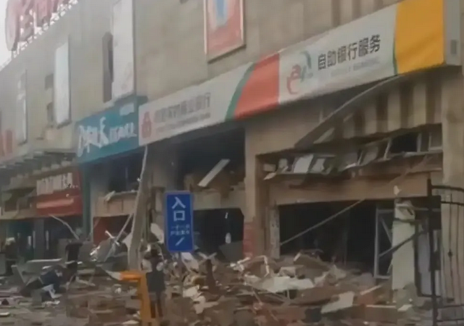 从视频中可以看到,临街的烤鱼店和银行玻璃已经全部碎裂,地面堆砌有大量砖块、桌椅等。当地人士向提供的现场视频里,事发时,爆炸波及的范围蛮大,现场有多人倒地。