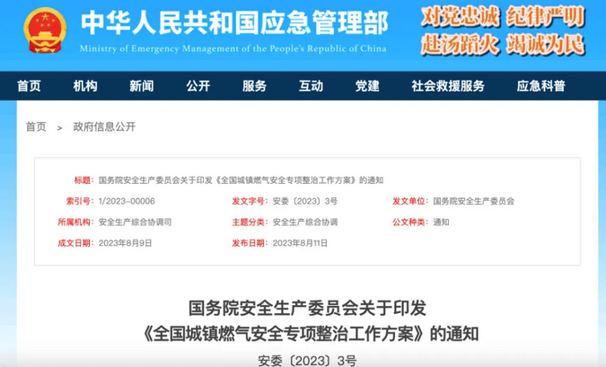2023年8月11日,应急管理部发布消息,为深刻汲取近年来城镇燃气安全重特大事故教训,全面加强城镇燃气安全风险隐患排查治理,切实保障人民群众生命财产安全,国务院安全生产委员会印发《全国城镇燃气安全专项整治工作方案》(以下简称《方案》)。