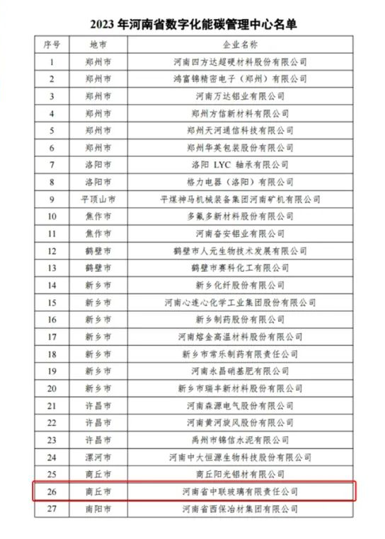 8月9日,河南省工业和信息化厅发布2023年度首批数字化能碳管理中心名单,河南省中联玻璃有限责任公司成功入选河南省数字化能碳管理中心。