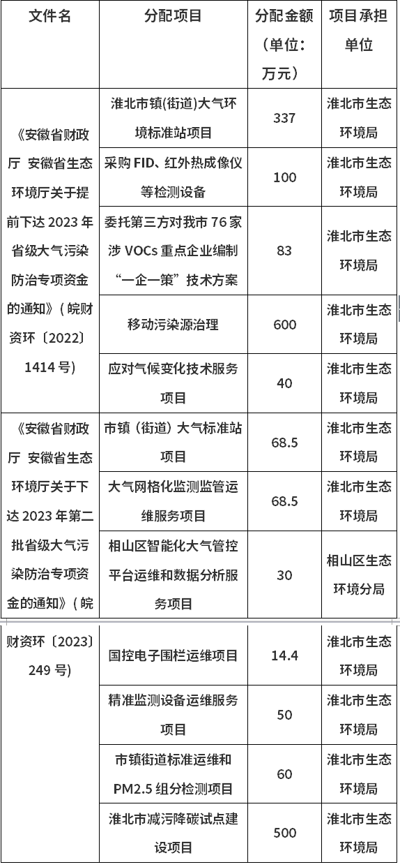 根据《安徽省财政厅 安徽省生态环境厅关于提前下达2023 年省级大气污染防治专项资金的通知》( 皖财资环〔2022〕1414号)和《安徽省财政厅 安徽省生态环境厅关于下达2023 年第二批省级大气污染防治专项资金的通知》( 皖财资环〔2023〕249号),淮北市共获得省级大气污染防治资金1951.4万元。现对分配情况进行公示。