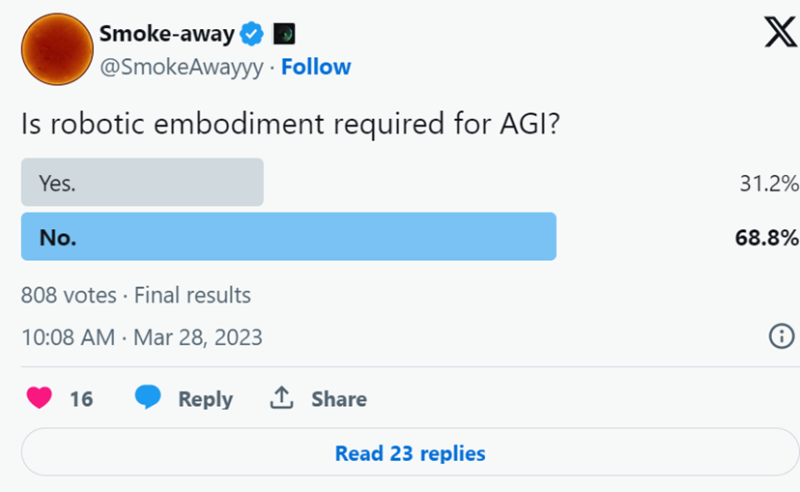 一部分研究人员认为,化身人类,拥有与环境互动和感知信息的能力,对发展AGI至关重要。人形机器人能拥有智能大脑,在社会不需要改变的情况下就能融入与参加。但也有一部分人认为,在没有“身体”的情况下,仍然可能实现AGI。然而,当下还没有足够的研究来证明这两种截然不同的观点。