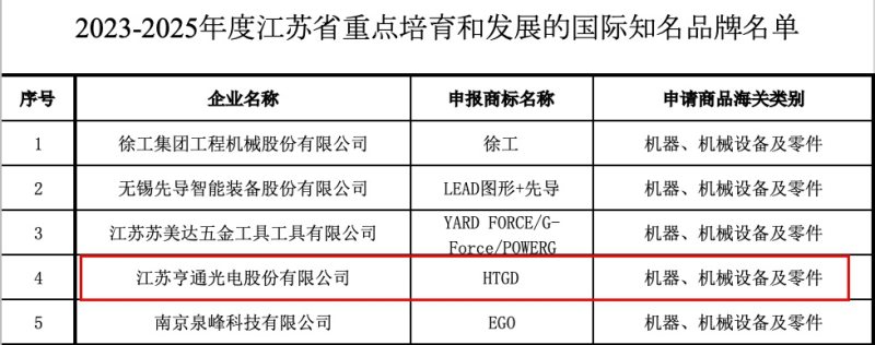 名单显示,江苏亨通光电股份有限公司入选。这是江苏省商务厅对亨通光电在提升自主品牌国际竞争力、努力开拓国际市场及坚持科技创新工作等方面的充分肯定。