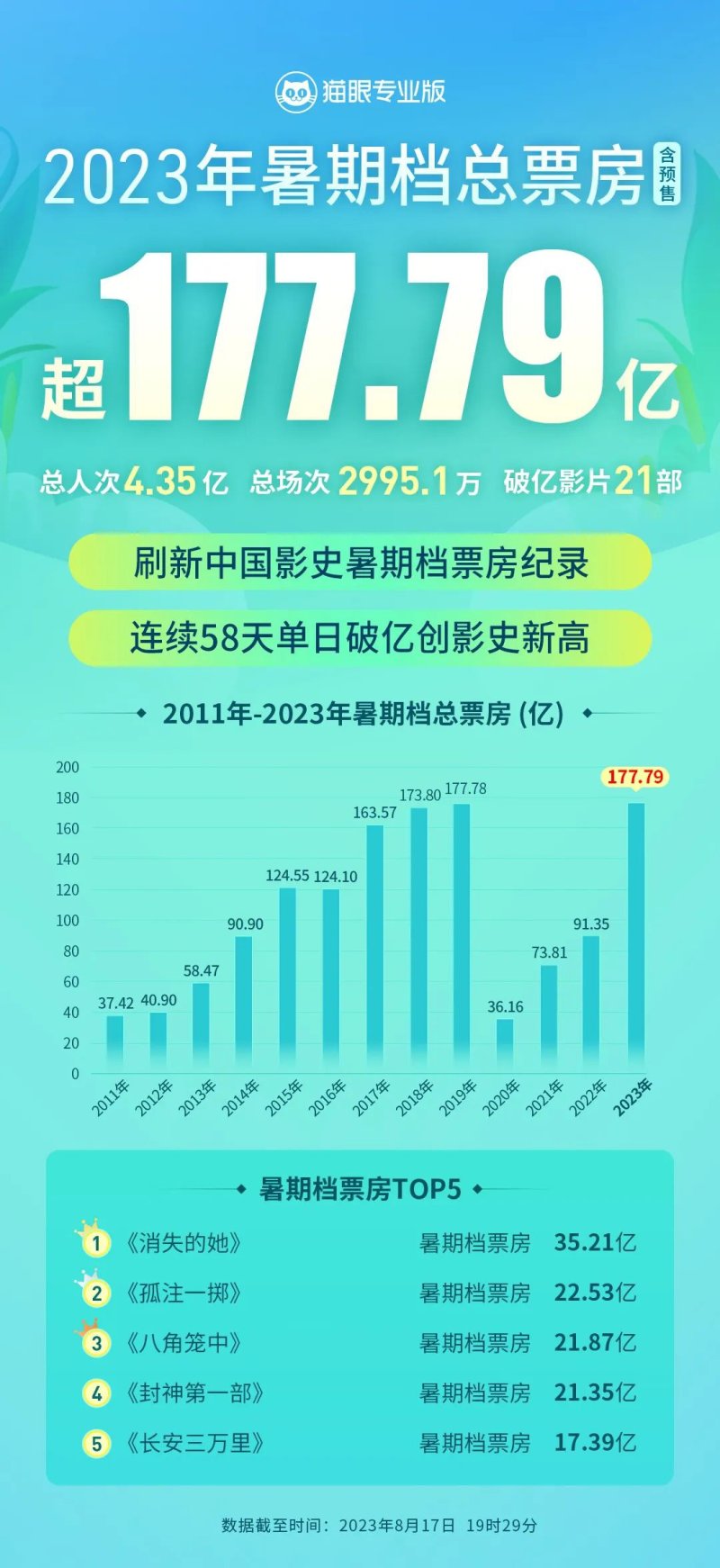 IT之家 8 月 17 日消息,据猫眼专业版数据,2023 年 8 月 17 日 19 时 29 分,2023 年暑期档总票房(含预售)突破 177.79 亿,超 2019 年暑期档票房成绩,刷新中国影史暑期档票房纪录。