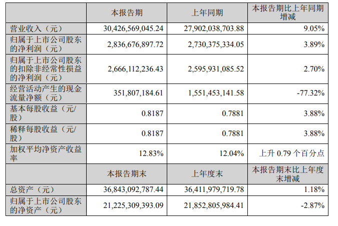 2023年上半年,双汇发展实现营业收入304.27亿元,较上年同期增长9.05%;归属于上市公司股东的净利润26.37亿元,较上年同期增长3.89%;归属于上市公司股东的扣除非经常性损益的净利润26.66亿元,较上年同期增长2.70%;基本每股收益0.82元,较上年同期增长3.88%。