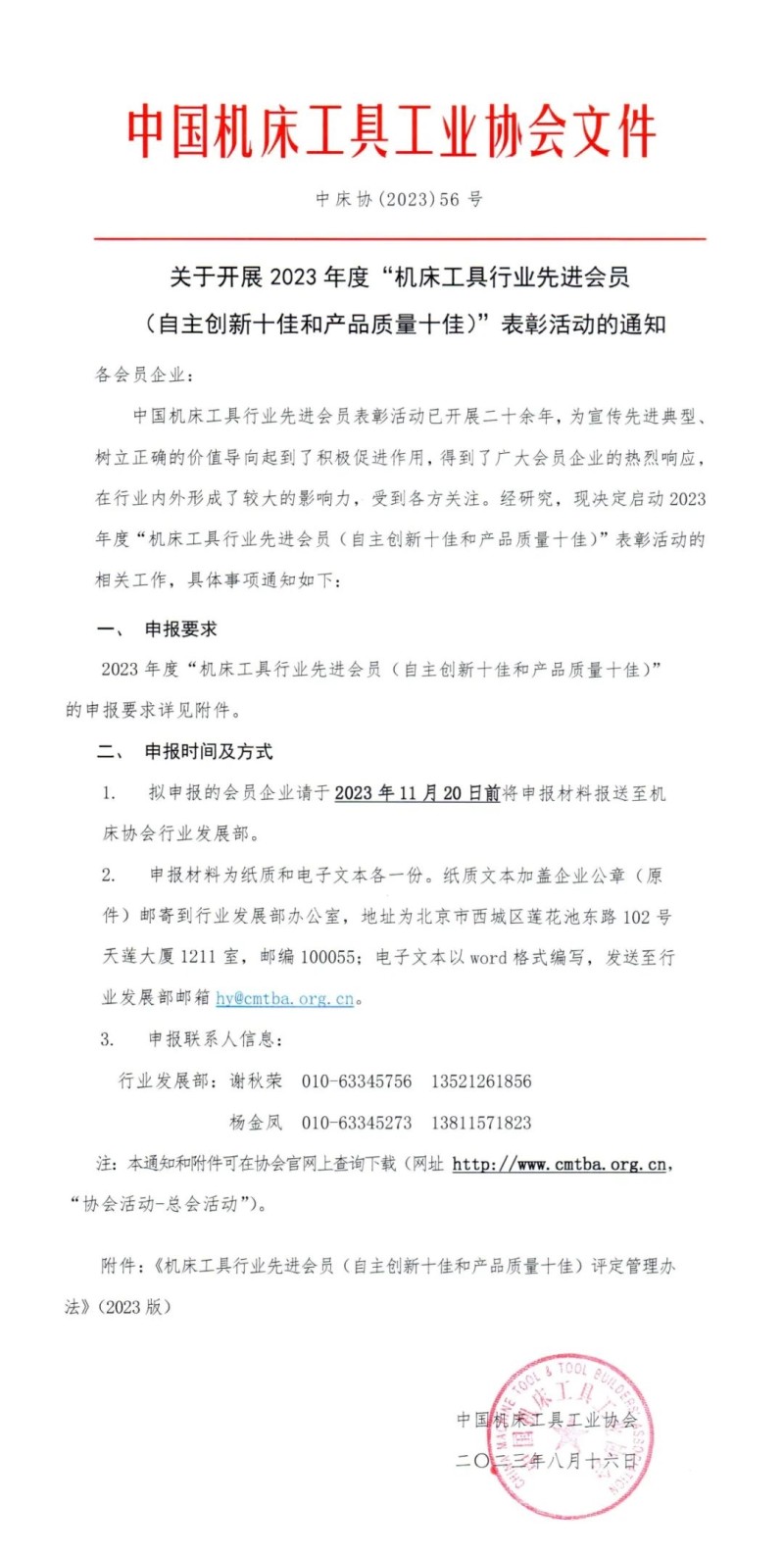 经研究,协会决定启动2023年度“机床工具行业先进会员(自主创新十佳和产品质量十佳)”表彰活动的相关工作,具体事项详见以下文件。请申报企业注意时间节点,于2023年11月20日前将申报材料报送至机床工具协会行业发展部。