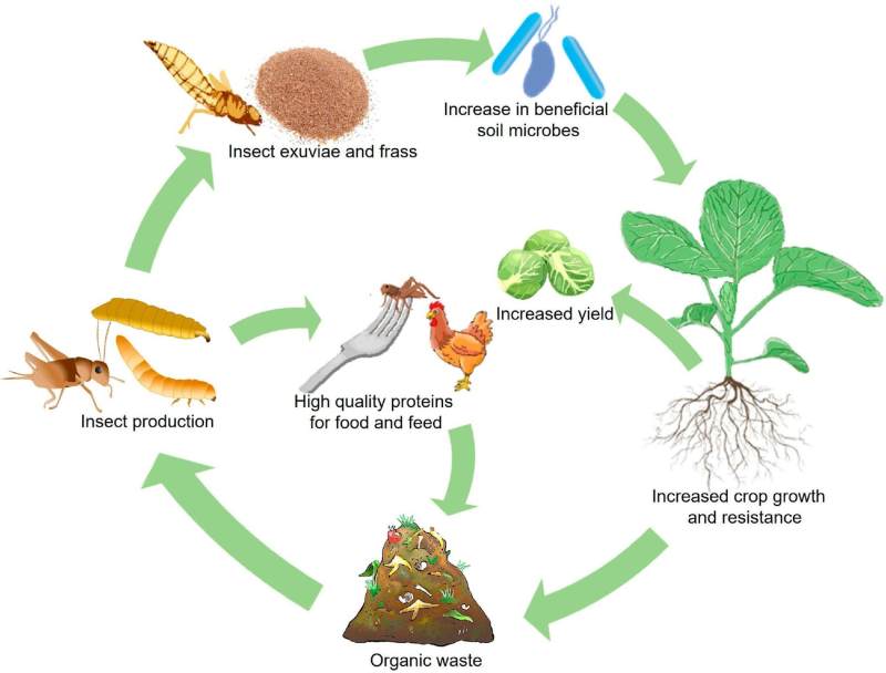 当添加到土壤中时,虫体和粪便可以促进植物生长和健康。昆虫粪便含有丰富的氮,这是一种对植物生长至关重要的营养物质,但在大多数土壤中是稀缺的,因此,它需要经常被添加到作物的合成肥料中。昆虫的外骨骼则富含甲壳素,这是一种大多数生物难以消化的聚合物。