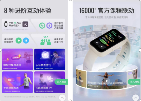 在软硬件结合方面,Keep 也带来了更有诚意的智能互联玩法,不仅手环、App 可以双向唤醒,还支持 8 种运动进阶体验,如:运动中心率、消耗数据实时同步、手环独立控制启停、运动中实时心率指导以及更具趣味性的课程玩法:手环拳击课实时感知挥拳动作,与 Keep 课程进行互动、跳绳数据监测、帕梅拉操课动作到位监测以及课程结束后手势互动等。