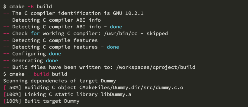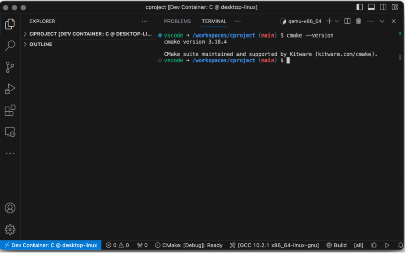 重要的是:这已在开发容器和vscode中被构建出来了!在你的远程实例中打开集成终端并执行CMake,如下所示: