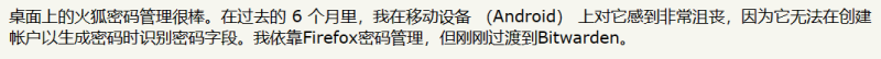 据使用者反馈:“具体到密码管理方面,Firefox在PC桌面上的性能很棒,但在移动设备(Android)上却表现一般,无法创建账户以生成密码识别字段。”