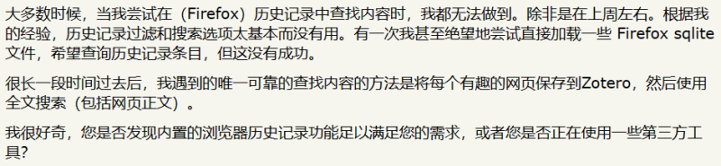 就Firefox本身来讲,也是有缺陷的,很多情况下,用户都无法在历史记录中查找内容,因此,历史记录过滤和搜索选项基本派不上用场。