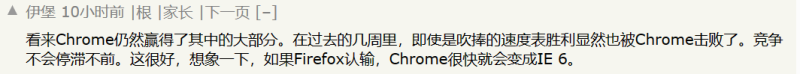 部分用户仍坚持认为Chrome赢了:“即使Firefox的速度备受吹捧,依旧被Chrome击败了。如果Firefox认输,Chrome很快就会变成IE6。”