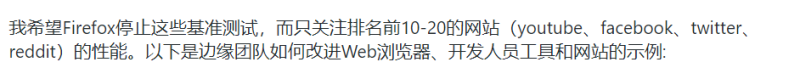 纵向来看,大家希望停止对Firefox的SunSpider基准测试,只关注排名前10-20的网站(Youtube、facebook、Twitter、Reddit)的性能。