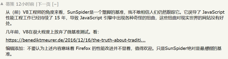 在技术社区里,很多专业人士也都认为SunSpider是“蹩脚”的基准测试,误导JavaScript性能长达15年,导致JavaScript引擎中出现各种奇怪的功能扭曲,对判断和改善网站性能会产生误导。