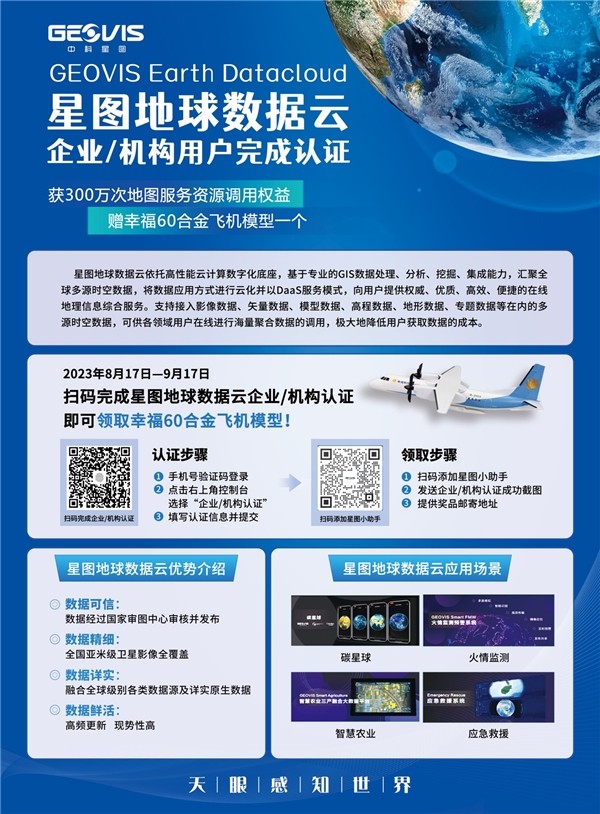 更新之后,让我们一起再次打开星图地球数据云,体验新版本,打卡锦绣中国。即日起完成企业/机构用户认证,即获300万次地图服务资源调用权益,赠新舟60幸福航空合金飞机模型,详情请参考文章末尾图片。