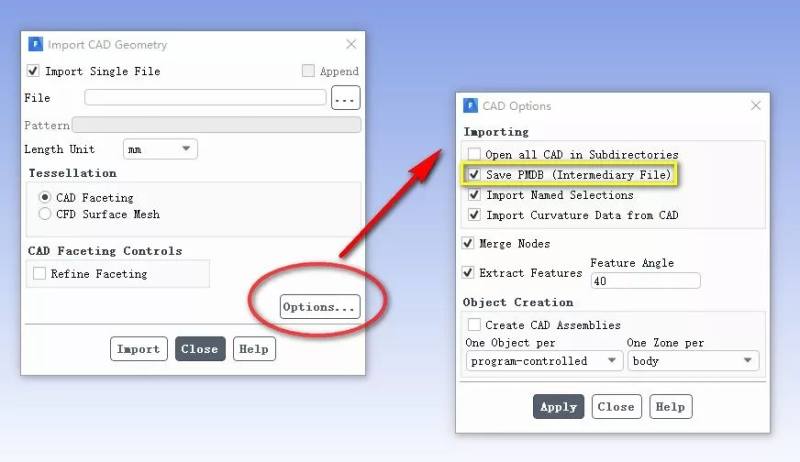 这个选项中的*.pmdb格式是ANSYS所支持的几何文件,和*.scdoc,*.agdb等格式类似,都是可以将CAD几何无错的传递到ANSYS的网格划分软件中来。