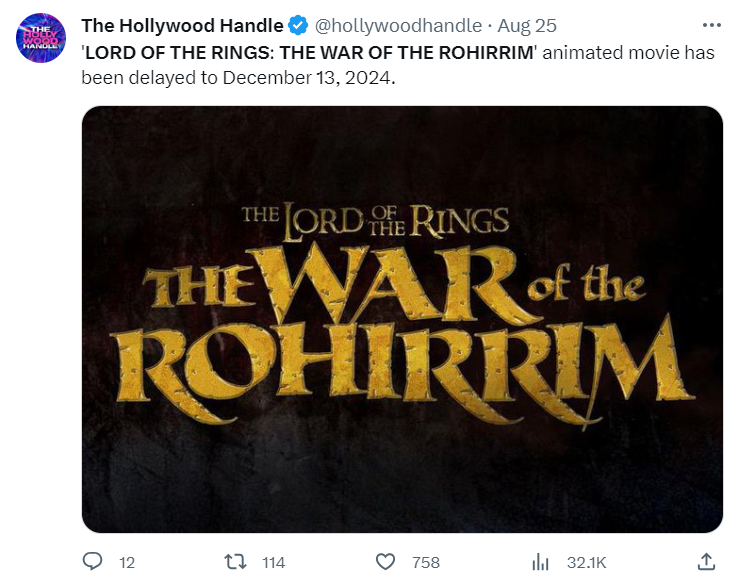 IT之家 8 月 27 日消息,动画电影《指环王:洛希尔人的战争》原定于 2024 年 4 月 12 日上映,由于美国演员与广电艺术家工会持续罢工,现推迟至 2024 年 12 月 13 日。华纳兄弟将在影院独家发行这部电影,首席执行官大卫・扎斯拉夫(David Zaslav)已承诺将致力于院线发行,并且不会制作在流媒体上播放的电影。