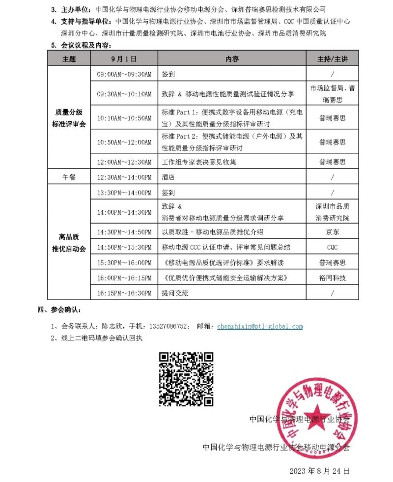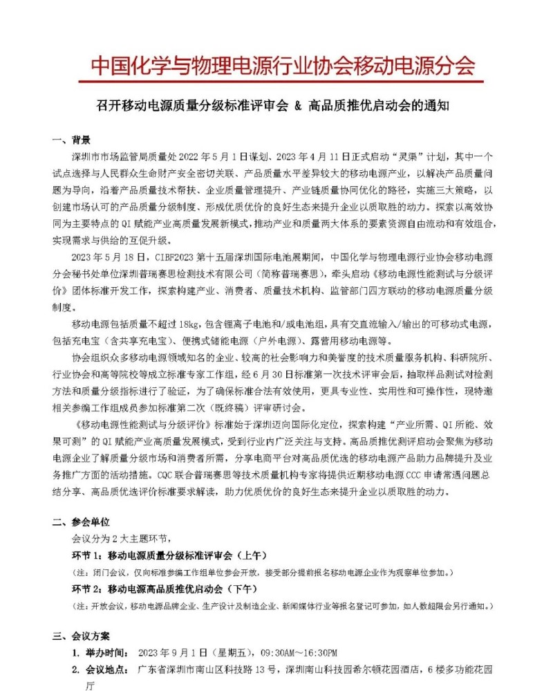 2023年5月18日,中国化学与物理电源行业协会移动电源分会秘书处单位深圳普瑞赛思检测技术有限公司(简称“普瑞赛思”),牵头启动《移动电源性能测试与分级评价》团体标准开发工作,探索构建产业、消费者、质量技术机构、监管部门四方联动的移动电源质量分级制度。已聚集众多移动电源领域知名的企业、具有社会影响力的技术质量服务机构、科研院校、行业协会等单位成立标准专家工作组,6月30日标准第一次技术评审会后,普瑞赛思抽取样品测试对检测方法和质量分级指标进行了验证。为了确保标准合法有效使用,更具专业性、实用性和可操作性,现邀请相关参编工作组成员参加标准第二次(即终稿)评审研讨会。本次移动电源质量分级标准评审会同期举办高品质推优启动会,帮助移动电源企业了解质量分级市场和消费者所需,分享电商平台对高品质优选移动电源产品的品牌提升及业务推广活动措施。同时,CQC将联合普瑞赛思等技术质量机构专家总结分析近期移动电源CCC申请常见问题,解读高品质优选评价标准要求,助力打造优质优价的产品生态体系。
