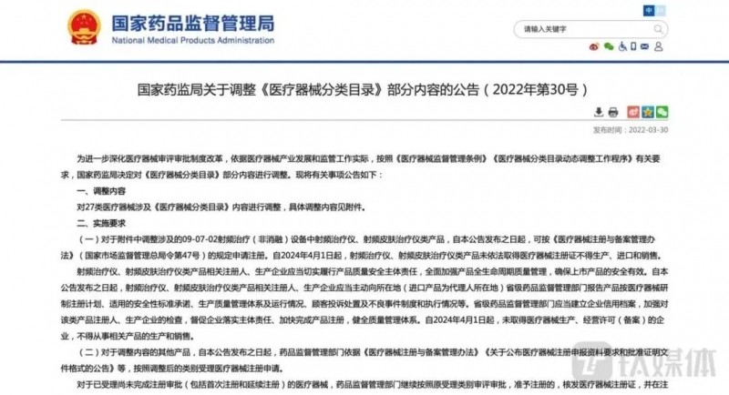 国家药监局发布公告明确,射频治疗仪、射频皮肤治疗仪可作为Ⅲ类医疗器械管理,产品按《医疗器械注册与备案管理办法》的规定申请注册。公告还指出,自2024年4月1日起,射频治疗仪、射频皮肤治疗仪类产品未依法取得医疗器械注册证不得生产、进口和销售。