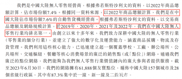 弗若斯特沙利文的资料显示,以2022年的商品销售总额来计算,友宝在线占中国大陆自动售货机运营商行业7.4%的市场份额。且以交易商品总额以及网络规模计算,于2019年、2020年、2021年及2022年,友宝在线在中国大陆无人零售行业均排名第一。