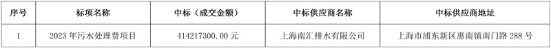 2023年8月25日,中国政府采购网发布了2023年污水处理费项目的中标(成交)结果公告,上海南汇排水有限公司以41421.73万元中标该项目。