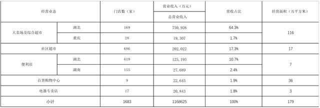中百集团2022年财报数据显示,大卖场及综合超市仍是其最大的经营业态,约占整体营收66%,197家门店经营总面积约占65%;社区便利超市业态,整体营收约占17%,686家门店经营总面积约占10%;便利店业态,整体营收占比13%,774家门店经营面积约占4%;百货购物中心及电器专卖店两种业态体营收占比不到4%,经营面积约占20%。