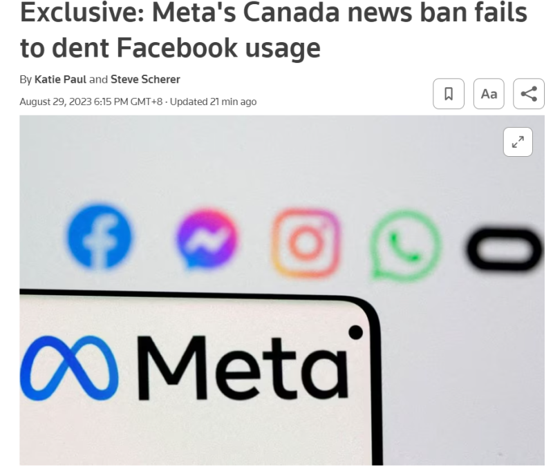 IT之家此前报道,加拿大“在线新闻法案”要求脸书和谷歌等互联网巨头付费使用当地媒体的新闻内容。Meta 表示,新闻仅占 Facebook feed 内容的不到 3%,对公司没有经济价值。