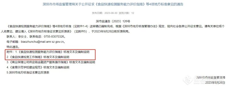 8月28日,深圳市市场监督管理局发布了公开征求《食品快速检测服务能力评价指南》等4项地方标准意见的通告,其中包含两项食品快检相关地方标准意见:《食品快速检测服务能力评价指南》与《食品快速检测工作指南》。