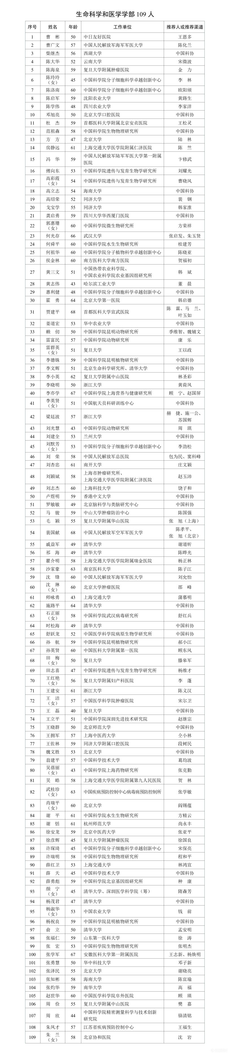 其中,公布的名单中数学物理学部有89人,化学部99人,生命科学和医学学部109人,地学部83人,信息技术科学部62人,技术科学部96人,另有特别推荐领域有效候选人45人。