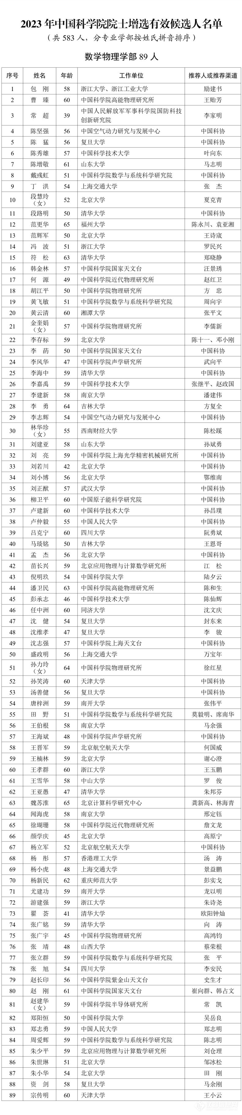 2023年中国科学院院士增选推荐工作已经结束。经第九届中国科学院学部主席团第十次会议审议,中国科学院党组审定,确认2023年中国科学院院士增选有效候选人583人。根据《中国科学院院士增选工作实施办法(试行)》的规定,现将有效候选人名单予以公布。