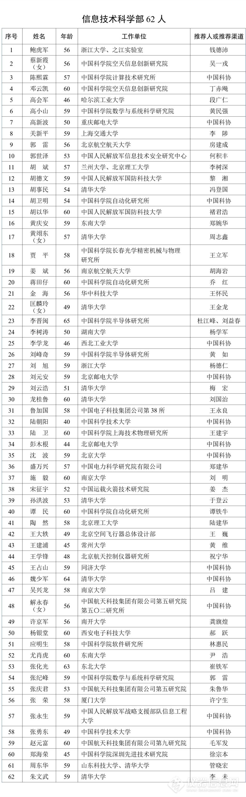 61 | 张奕群 | 1962年8月 | 中国航天科工集团第二研究院第二总体设计部 | 中国科协 |