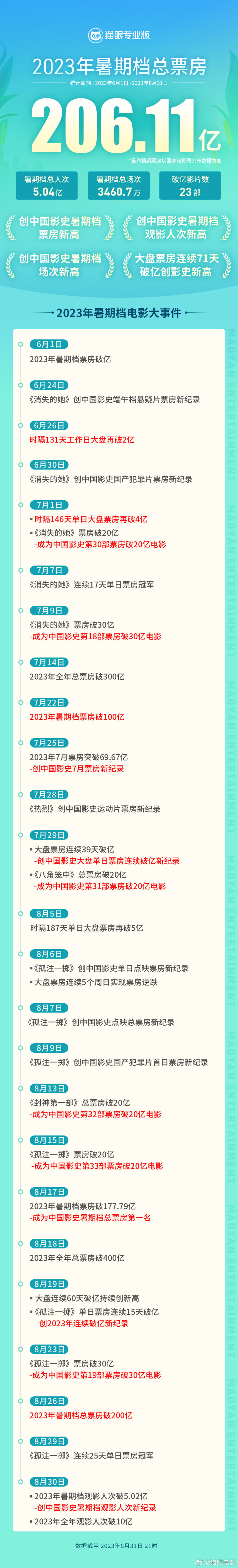 7 月 25 日:2023 年 7 月票房突破 69.67 亿,刷新影史 7 月票房纪录