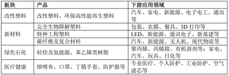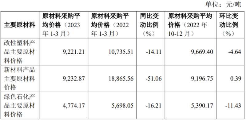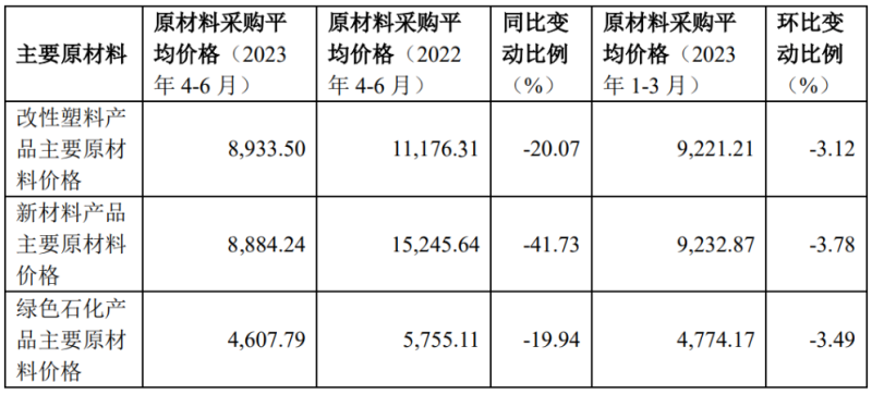注:1、改性塑料主要原材料包括:聚烯烃系树脂、聚苯乙烯系树脂、工程树脂。2、新材料产品主要原材料包括:丁二醇、精对苯二甲酸、精己二酸、癸二胺。3、绿色石化产品主要原材料包括:低温丙烷、混合碳四、有机化学原料。