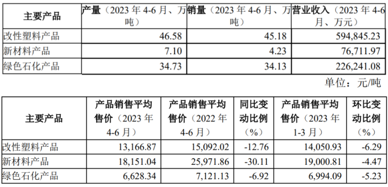 分季度来看,一季度改性塑料产品销量40.59万吨,销售收入57.04亿元;二季度改性塑料产品销量45.18万吨,销售收入59.48亿元;