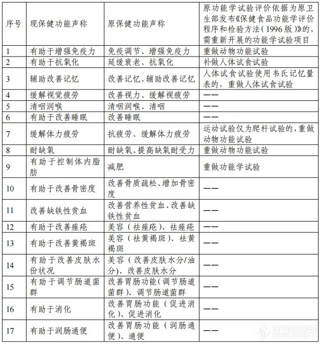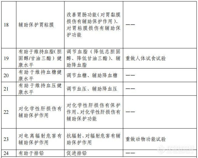2. 无法提供上市后人群食用功能学评价研究报告的,可提供按照《保健食品功能检验与评价方法(2023 年版)》、原食品药品监管局 2012 年修订发布的《关于印发抗氧化功能评价方法等 9 个保健功能评价方法的通知》或《保健食品检验与评价技术规范(2003 年版)》重做的功能学试验报告,其中,原功能学试验报告评价要求和标准为《保健食品功能学评价程序和检验方法(1996 版)》的,需重新开展的功能学试验项目见上表要求,“— —”表示不需提供保健功能再评价资料。