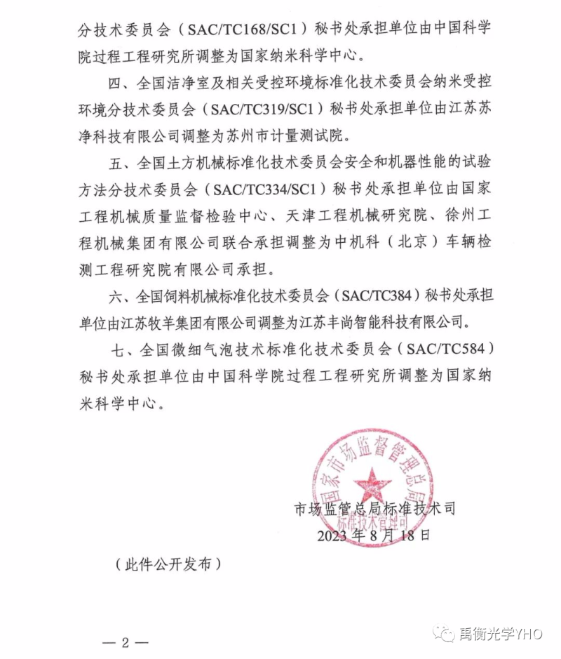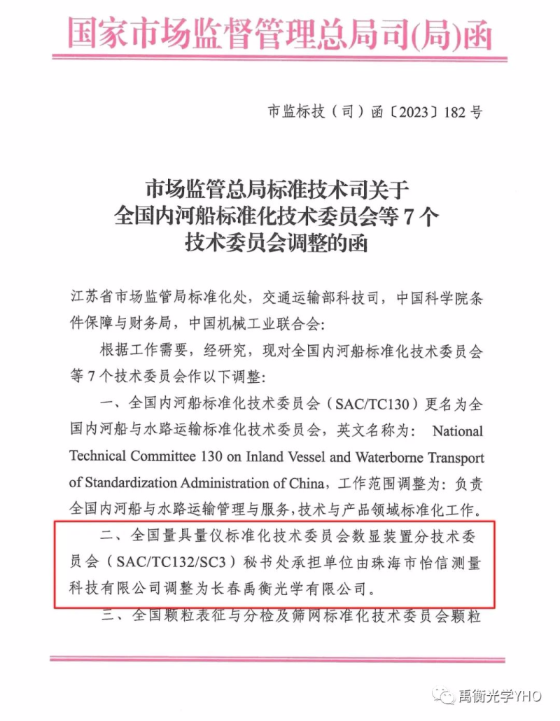 7个技术委员会调整的函》,文件明确了全国量具量仪标准化技术委员会数显装置分技术委员会(SAC/TC132/SC3)秘书处承担单位由珠海市怡信测量科技有限公司调整为长春禹衡光学有限公司(以下简称禹衡光学)。