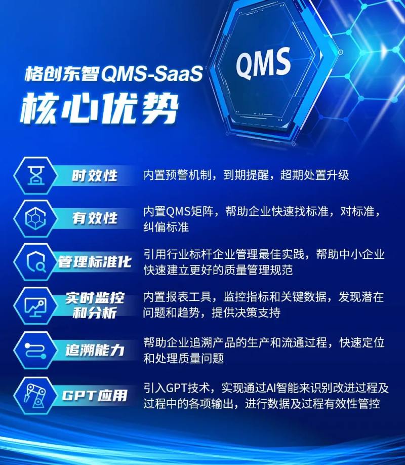 对于许多中小型企业、初创企业而言,通常需要快速建立质量管理体系,以确保产品和服务的质量。格创东智QMS SaaS化解决方案可以提供快速部署和易用的功能,无需较长的实施周期及高昂的项目费用,它提供了采用先进技术的另一个途径,降低了企业购买、构建和维护基础设施和应用程序的“门槛”,帮助企业降低成本、提高效率,快速实现质量管理的数字化转型。
