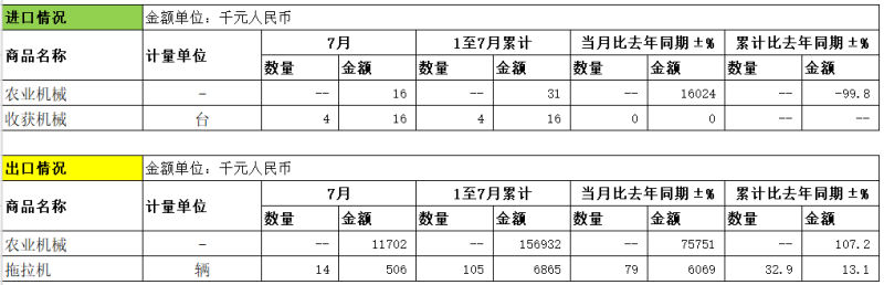 收获机械方面:进口数量为4台,进口金额为16千元;1至7月累计进口数量为4台,累计进口金额为16千元。