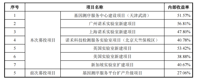 另需注意的是,诺禾致源测算得出本次募投项目的内部收益率约为40%以上,高于前次募投基因测序服务平台扩产升级项目的27.06%。此举亦引发上交所关注。