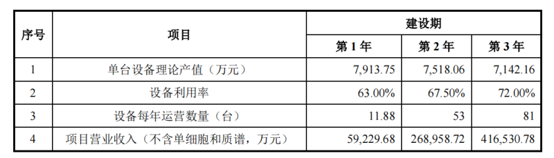 此外,建设期间,每年的累计购置设备台数为36、70、92,综合考虑折算系数,实际每年运营的设备台数为11.88、53、81。由此得出,建设期3年间的营业收入(不含单细胞和质谱)为5.92亿元、26.9亿元、41.65亿元。