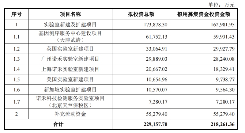 细分来看,实验室项目还包含了7个子项目,分别是“基因测序服务中心建设项目(天津武清)”、“诺禾科技检测服务实验室项目(北京天竺保税区)”、“新加坡实验室扩建项目”,以及英国、美国、广州诺禾、上海诺禾4个实验室的新建项目。