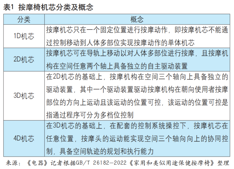 按摩机芯分类、“零重力”和“零靠墙”是当前新版按摩椅国家标准实施后,遇到问题最多的3个内容。新版按摩椅国家标准明确定义了机芯分类(详见表1)。据张云龙介绍,该机芯分类标准杜绝了6D和8D机芯这种夸张宣传,但另一方面,有一些企业在3D和4D机芯宣传时“打擦边球”。