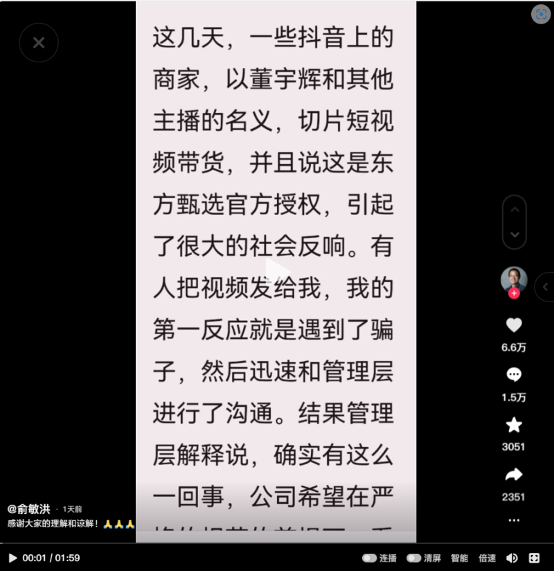 IT之家 9 月 10 日消息,本周六上午,新东方、东方甄选创始人俞敏洪通过抖音就近日网上出现大量董宇辉视频切片一事致歉。