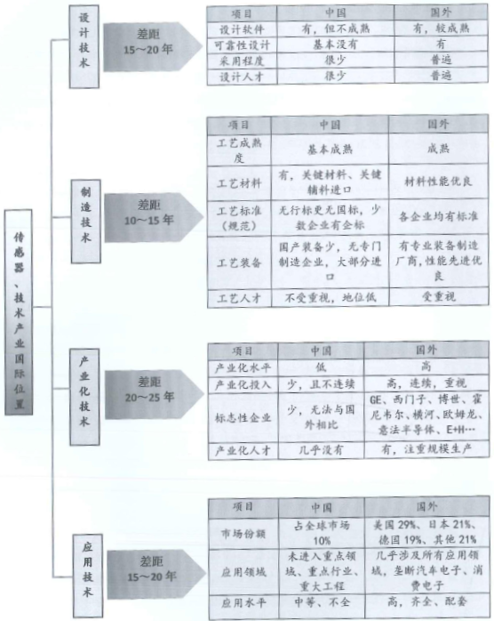 9、中国传感器的国内、外位置,差距在15~20年,产业化差距最大!传感器在国内产业布局中仅位于次重要位置!