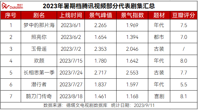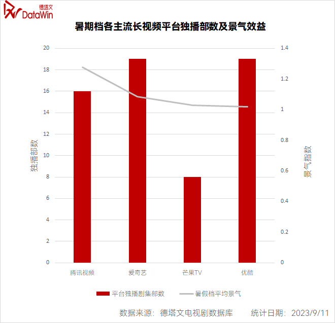 按照暑期档统计时间范围:当年6月1日-8月31日,据德塔文数据显示,今年暑期档腾爱优芒主流长视频平台共播出80部剧,其中腾讯视频、爱奇艺、优酷、芒果TV分别累计播出剧集23、26、22、9部。而在四大平台暑期档剧集平均景气指数中,腾讯视频以近1.2排在第一,彰显其在今年暑期档的领先地位。