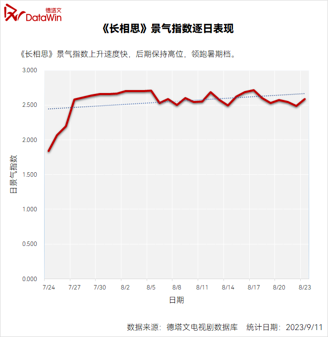 该剧不仅为今年暑期档德塔文景气峰值最高的剧集,也是今年为止景气指数峰值最高的古装剧,并蝉联德塔文电视剧景气指数7月、8月双榜冠军。重点是,《长相思 第一季》于7月最后一周上线,仅用七天就全面引爆热度,成为暑期档一枝独秀。